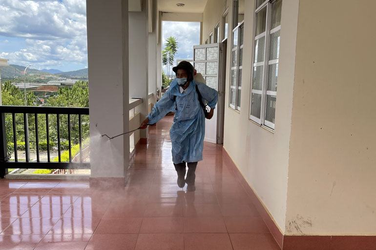 | Phun hóa chất khử khuẩn tại cơ sở cách ly tập trung Trung tâm Huấn luyện bồi dưỡng nghiệp vụ Công an tỉnh (P7 - Đà Lạt). |